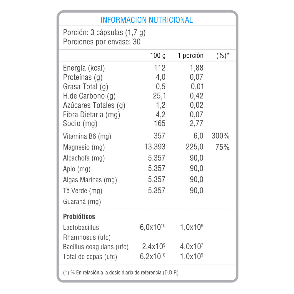 Incluye té verde y guaraná que dará un suave estimulo de energía. También contiene probióticos, para tener una flora intestinal equilibrada, que es esencial para la digestión y la salud en general.