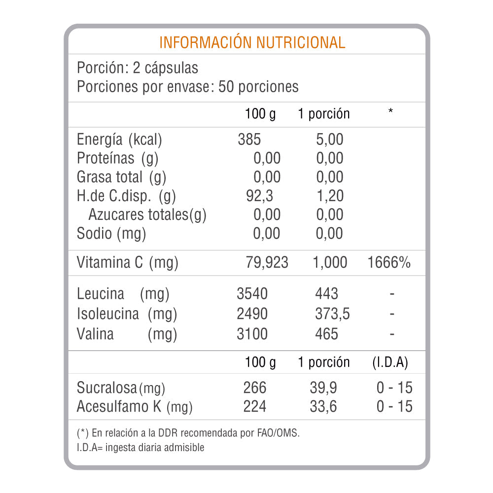 1 porción (2 comprimido): 1000 mg Vitamina C (Ácido Ascórbico)